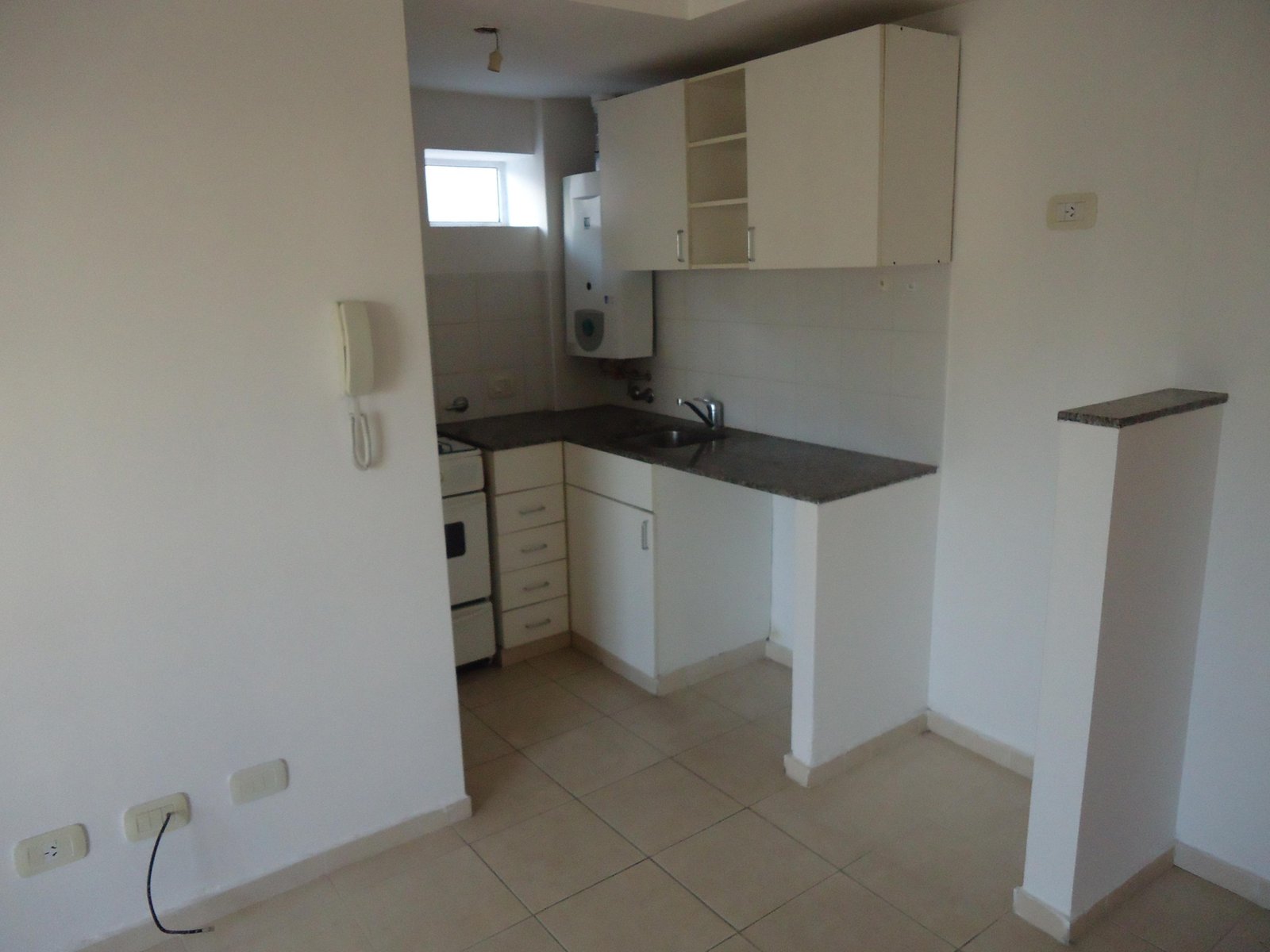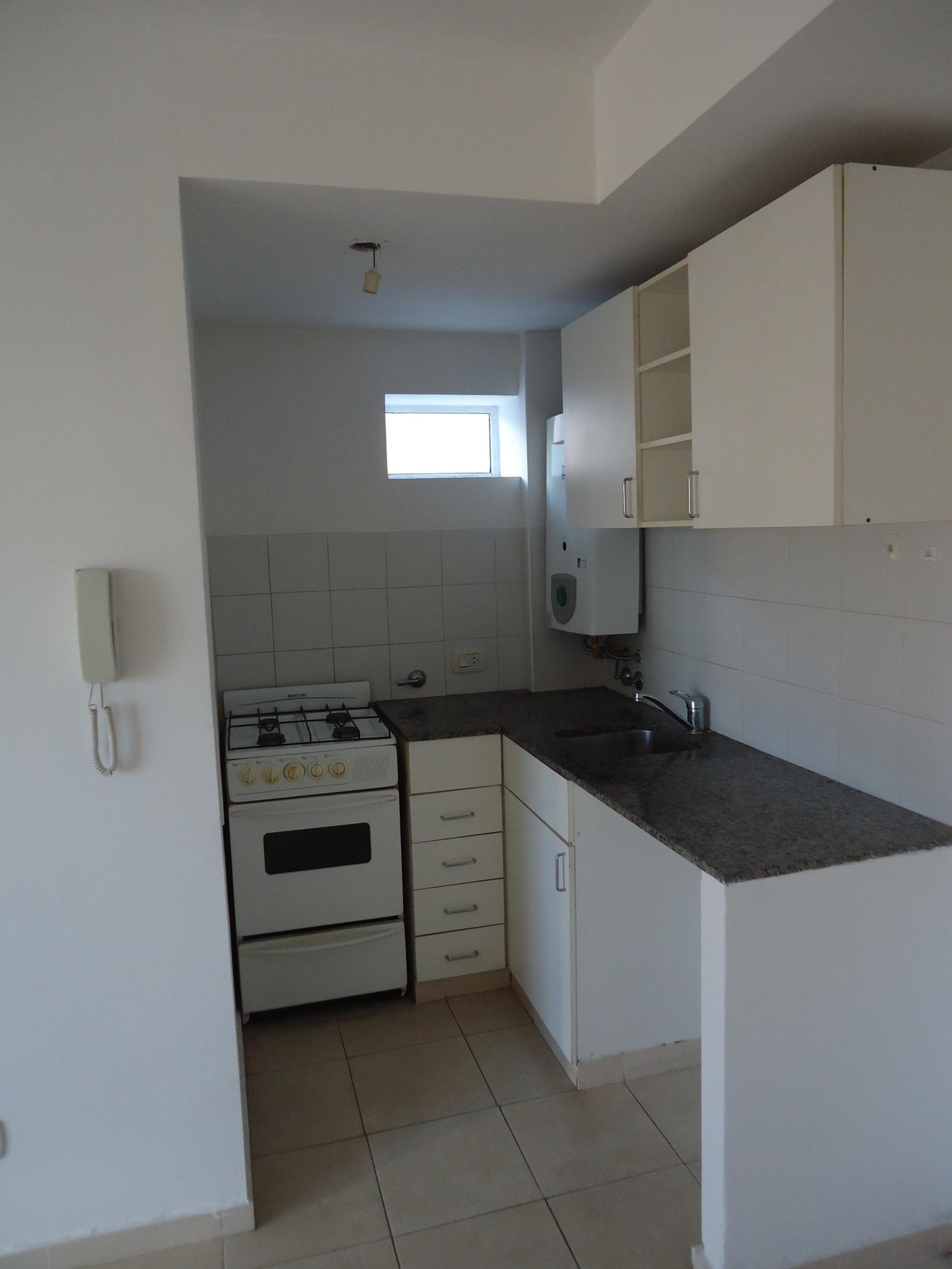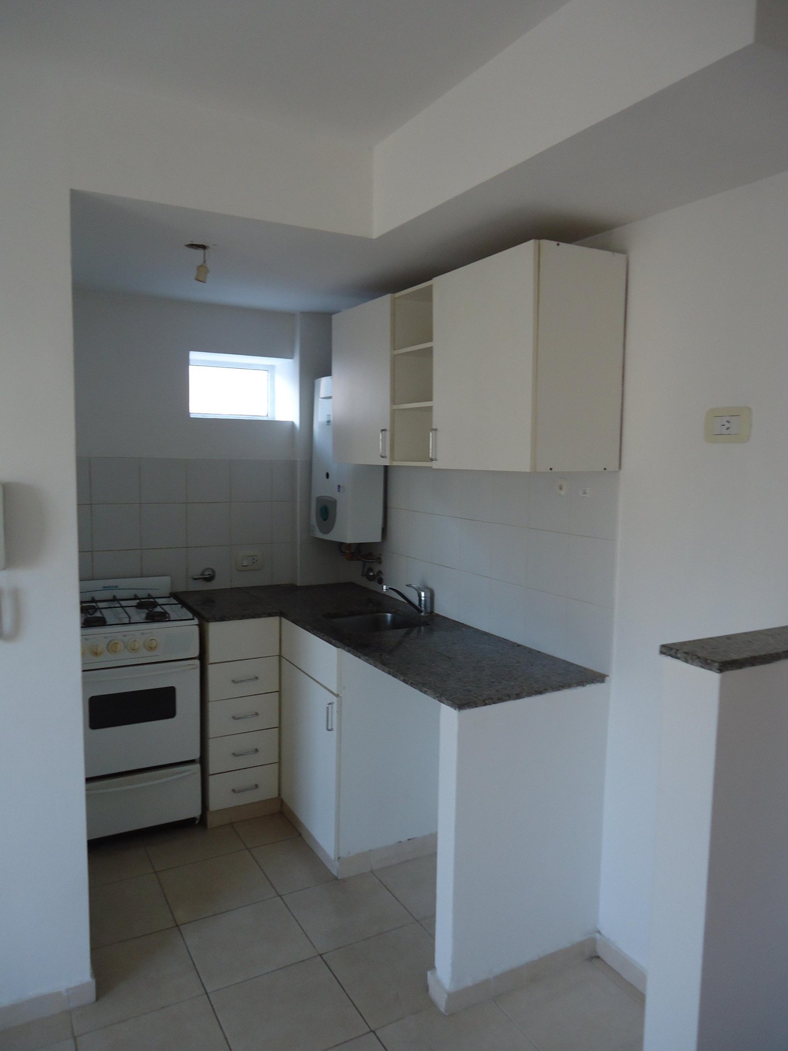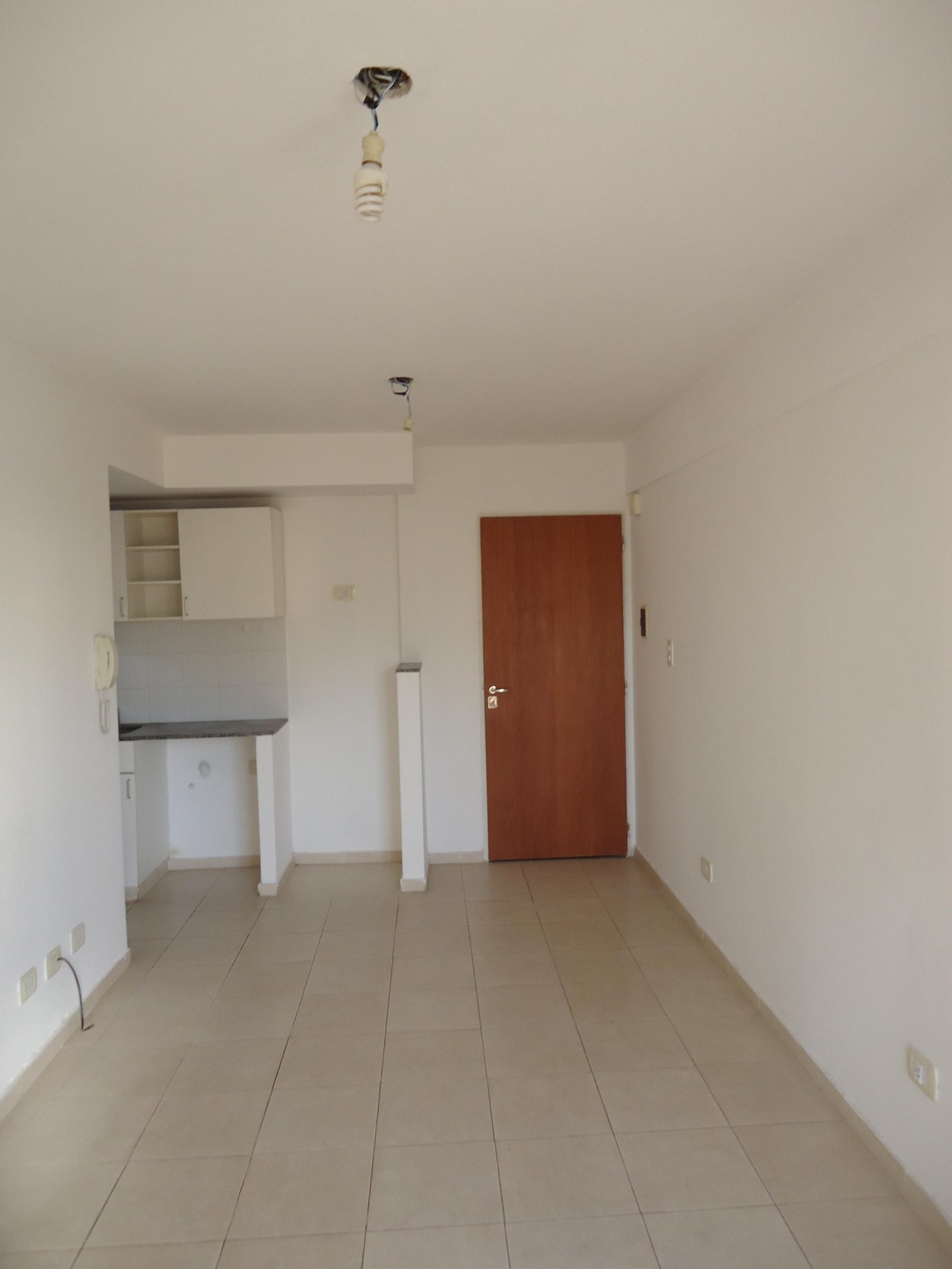 Depto externo con balcón, living con la cocina integrada, dormitorio con placard y baño completo.