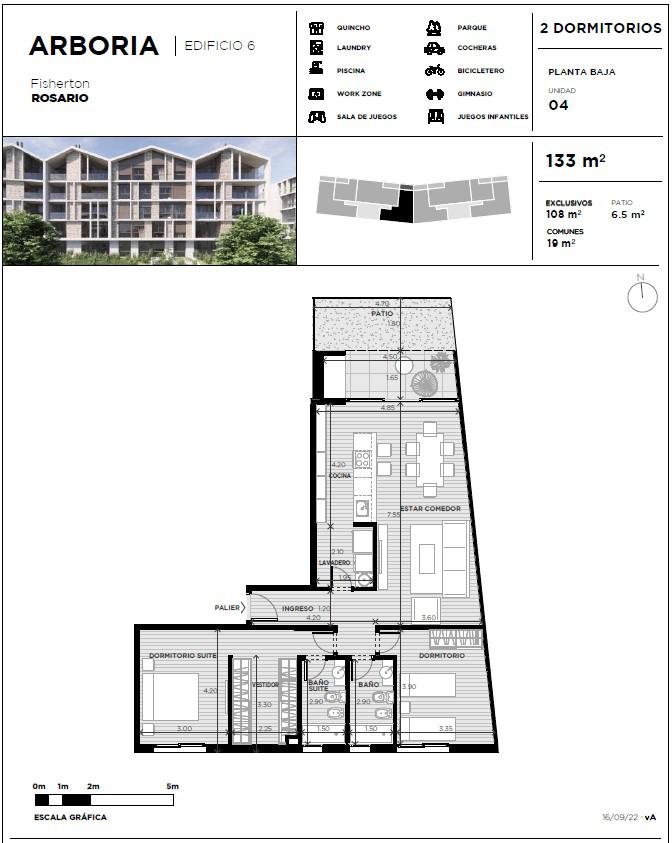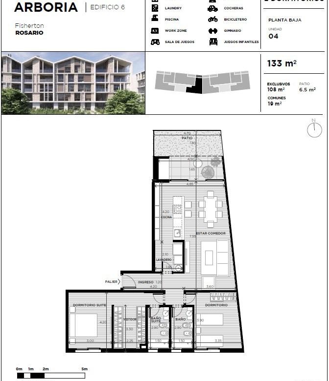 Con rápidos y cómodos accesos, se encuentra a una corta distancia del centro de Rosario y la ciudad de Funes, brindando conectividad excepcional con la región. El edificio también dispone de servicios adicionales como gimnasio, parrilla, quincho, solárium, piscina, y es apto para mascotas, asegurando que todas las necesidades de los residentes estén cubiertas.