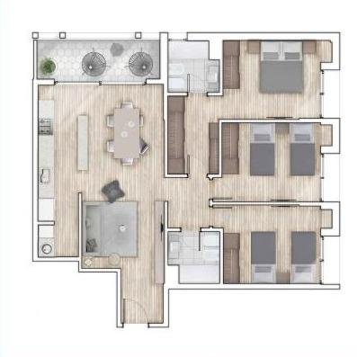 Este departamento, situado al frente con vistas a la calle, dispone de un ingreso a un amplio living comedor que se extiende hacia un espacioso balcón. La cocina está integrada y cuenta con un práctico espacio para lavadero. La unidad comprende tres dormitorios, siendo el principal en suite con vestidor y baño privado. Además, se incluye un baño adicional con receptáculo de ducha.