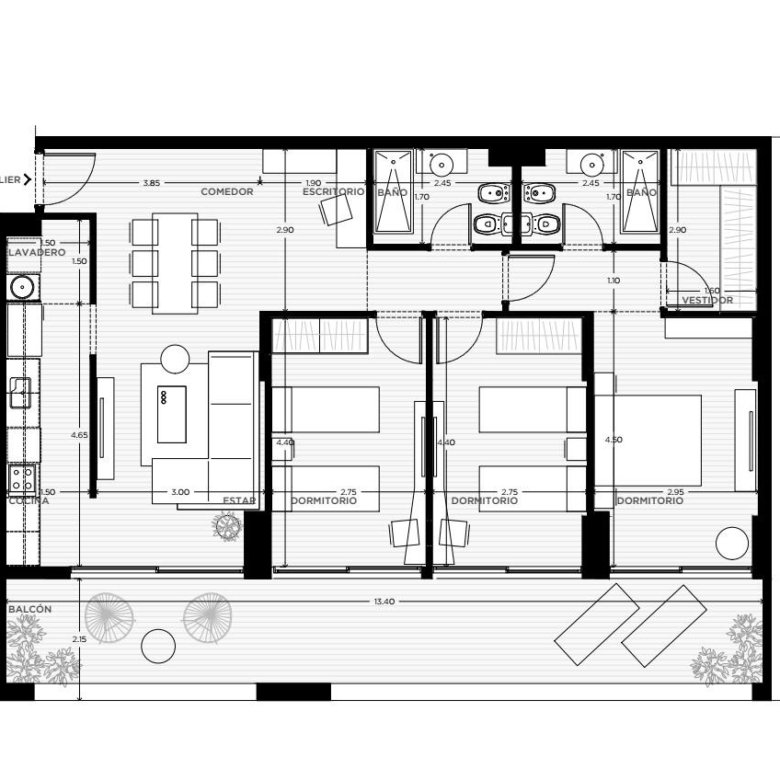 Departamento de tres dormitorios. Al frente con balcón sobre Av Carballo. 138.5 mts exclusivos, 161 mts totales (exclusivos+comunes). Ingreso a living comedor con salida a balcón, cocina separada por barra desayunadora, espacio lavadero. Espacio escritorio, paso a íntimos, tres dormitorios con placares, principal en suite con vestidor, dos baños con bañera.
