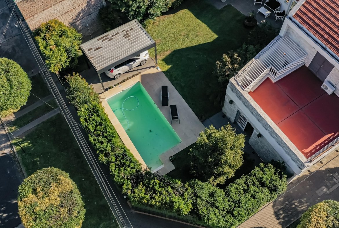 El exterior no se queda atrás: disfruta de una refrescante pileta y un quincho o salón de usos múltiples impresionante, equipado con parrillero, baño, y un playroom en entrepiso que se abre a una terraza con vistas al jardín.