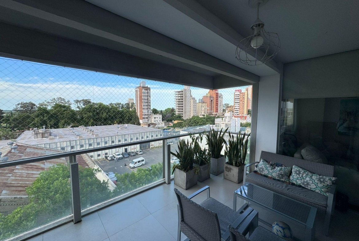 Departamento de dos dormitorios al frente con balcón amplio, vista parcialmente amplia hacia el rio, al ingresar al departamento contamos con cocina separada y un amplio living comedor, un baño, luego al pasillo donde divide los dormitorios, ambos con placares con puertas corredizas y el principal con baño en suite y balcón al contra frente, cuenta con persiana. En la terraza podemos observar una increíble vista, solarium y pileta, el edificio cuenta con dos ascensores y cocheras.