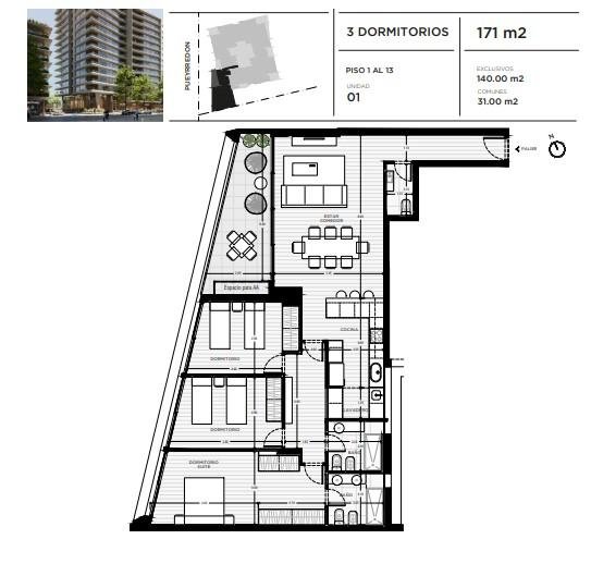 Ingreso a living comedor con cocina integrada y espacio comedor diario. Salida a amplio balcón. Toilette. Paso a íntimos. Lavadero independiente. Baño con receptáculo de ducha. Tres dormitorios con placares, el principal en suite con vestidor y baño con receptáculo de ducha